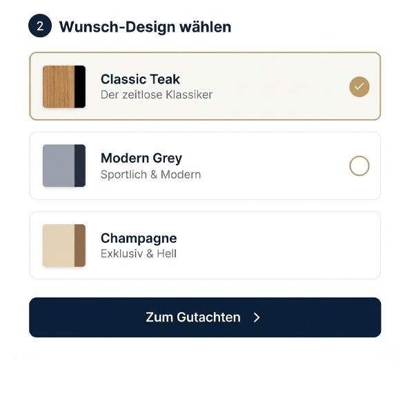 Egal, ob Ihr Deck stark gewölbt oder nahezu flach ist. Wissen wir genau, wieviel Material von Backbord bis Steuerbord sowie vom Heck bis zum Bug benötigt wird. Da bleibt nichts offen. Versprochen.