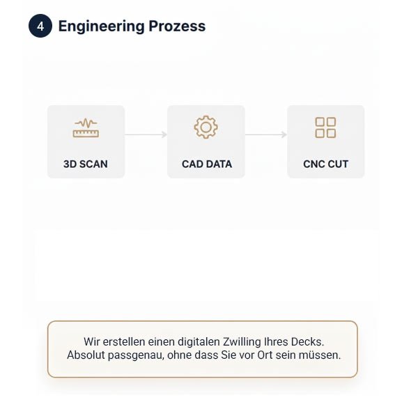 Wir digitalisieren Ihr Deck per 3-Scan. Unsere Ingenieure und Vermessungspartner erstellen CAD-Daten die eine perfekte Erstellung der Decksbeläge sicherstellen.