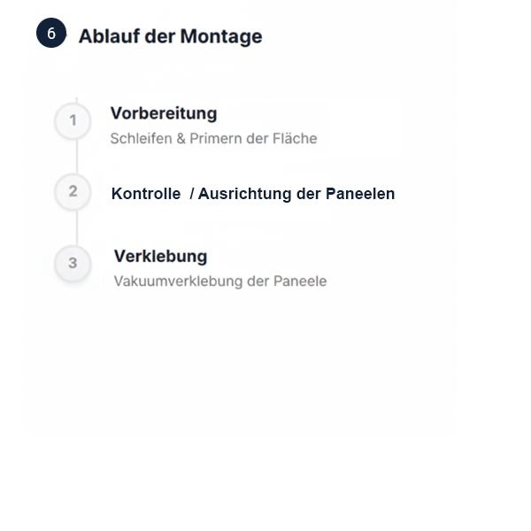 Vorbereitung ist alles! Deshalb bereiten wir den Untergrund optimal vor. Je nach Untergrund werden Schraubenlöche verschlossen, kleine Unebenheiten beseitigt. Eine gute Grunddierung bildet die Basis für den optimalen Aufbau der Haftsysteme. Passend zum gewählten Material werden die vorgeschriebenen Klebesysteme eingesetzt, um die Garantierversprechen der Materialprozuzenten abzusichern.