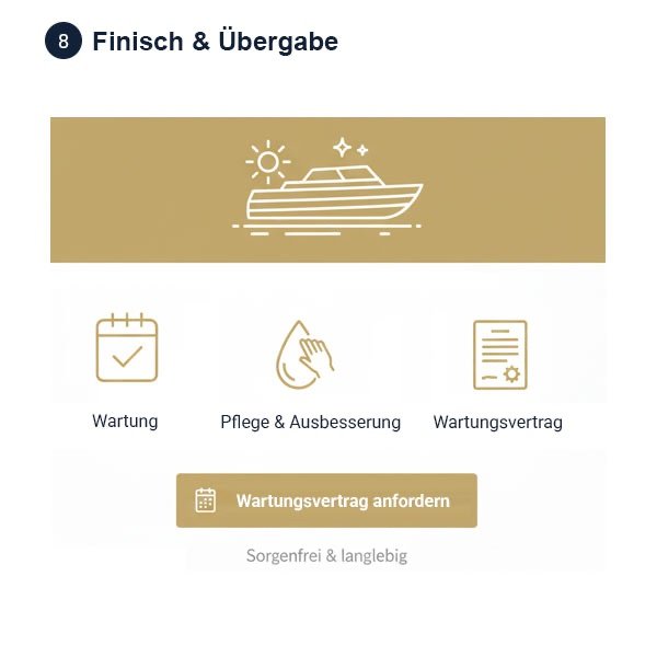 Damit Ihr Deck lange so aussieht wie am ersten Tag, schauen wir gern regelmäßig für Wartung und Pflege bei Ihnen vorbei. Kleine Missgeschicke können immer passieren. Deren Folgen beseitigen wir im Rahmen unserer Wartung gern. Wir bieten Ihnen einen Pflege- und Wartungsvertrag an, damit Sie sich immer darauf freuen können, das Deck Ihres Bootes zu betreten – egal, ob barfuß oder in sportlichem Schuhwerk.